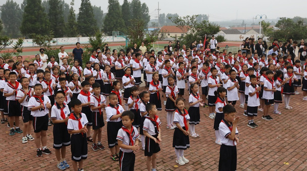 在开营仪式上,泊乐合唱团向五所学校捐赠了自主研发的教材及全套教案,山东省扶贫开发基金会教育扶贫部杨婷婷部长为泊乐合唱团授予新时代文明服务志愿者团队队旗,上海师范大学王超老师及举办地少先队员代表相继进行了发言。