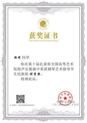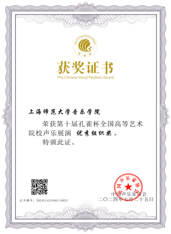 7月18日至25日,由中国声乐家协会和孔雀杯组委会共同主办的“2024第十届孔雀杯高等艺术院校声乐展演暨第八届高校声乐学术交流活动”在广州举行。经过展演、总展演两轮比赛,我校音乐学院师生在比赛中取得优异成绩:荣获优秀组织奖1项,“金孔雀杯”2项,“银孔雀杯”2项,“铜孔雀杯”3项,学术论文三等奖1项,优秀奖7项,优秀指导教师奖4项。