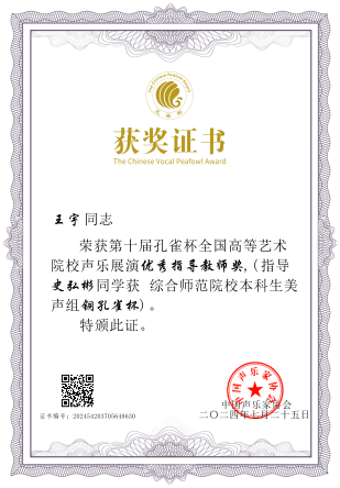 史弘彬 | 21级本科音乐表演(中俄) | 综合师范院校本科生美声组 | 铜孔雀杯 优秀指导教师奖:王宇 |