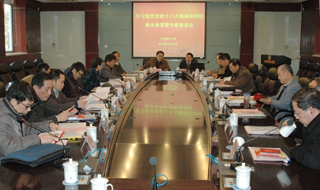 12月6日下午,我校党的十八大精神宣师团集体备课暨专家座谈会在外宾楼举行。宣讲团团长、校党委书记陆建非,宣讲团团长、校长张民选,宣讲团副团长、校党委副书记黄刚以及宣讲团成员参加了此次会议。