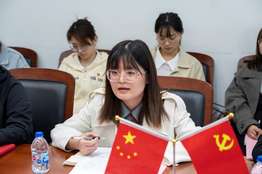 物理化学(研)党支部书记阮楠楠同学作为研究生党支部书记代表发言,她介绍了党支部的基本情况,分享了党支部工作的两大原则,即思想有深度、活动有广度。介绍了研究生样板党支部项目“立报国之志,强科创之力——助力研究生新生成长”的目标和计划,为各党支部提供了参考和借鉴。