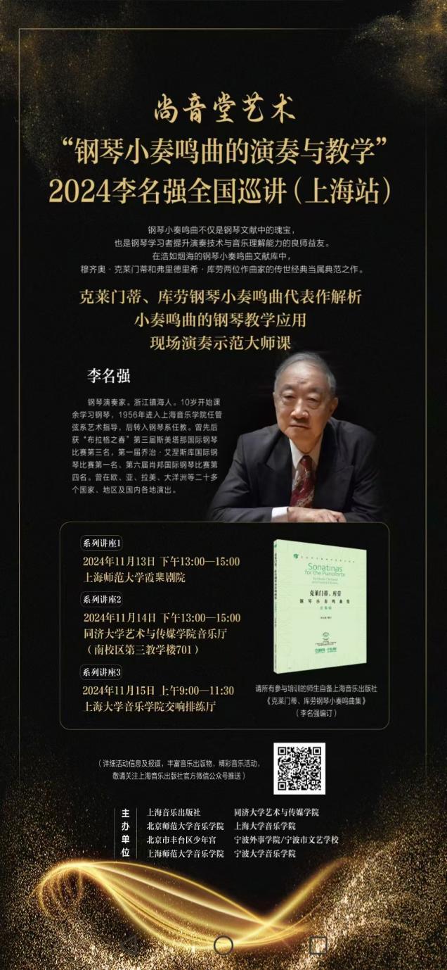 李名强教授是我国钢琴界的泰斗级人物,曾担任上海音乐学院副院长和上海钢琴协会主席,不仅在国内外各大钢琴比赛中屡获殊荣,还曾担任波兰肖邦国际钢琴大赛、美国范·克莱本国际钢琴大赛等国际赛事的评委。在钢琴教育领域,李名强教授同样享有盛誉,其多年的辛勤耕耘,为我国钢琴教育事业的发展做出了巨大贡献。