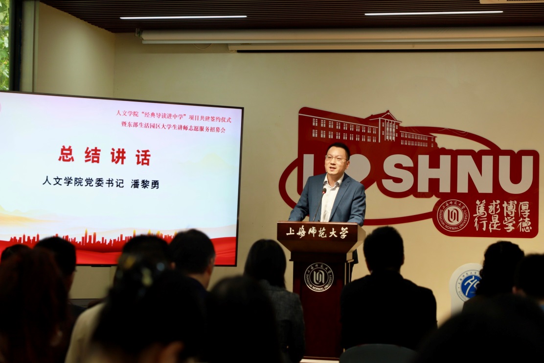 本次活动既是人文学院“经典导读进中学”项目与各共建单位推进合作、促进交流、加深友谊的新起点,也是学院“访企拓岗促就业”行动的有力举措。同时,作为上海师范大学首批学院党委包干社区的试点单位,人文学院这一项目将长期面向东部学生生活园区广泛招募大学生讲师志愿者,强化教师教育能力培养,助力更多有志于从事中学语文教学的学生们提前走入中小学课堂,在传承经典、弘扬人文精神的道路上不断前行!