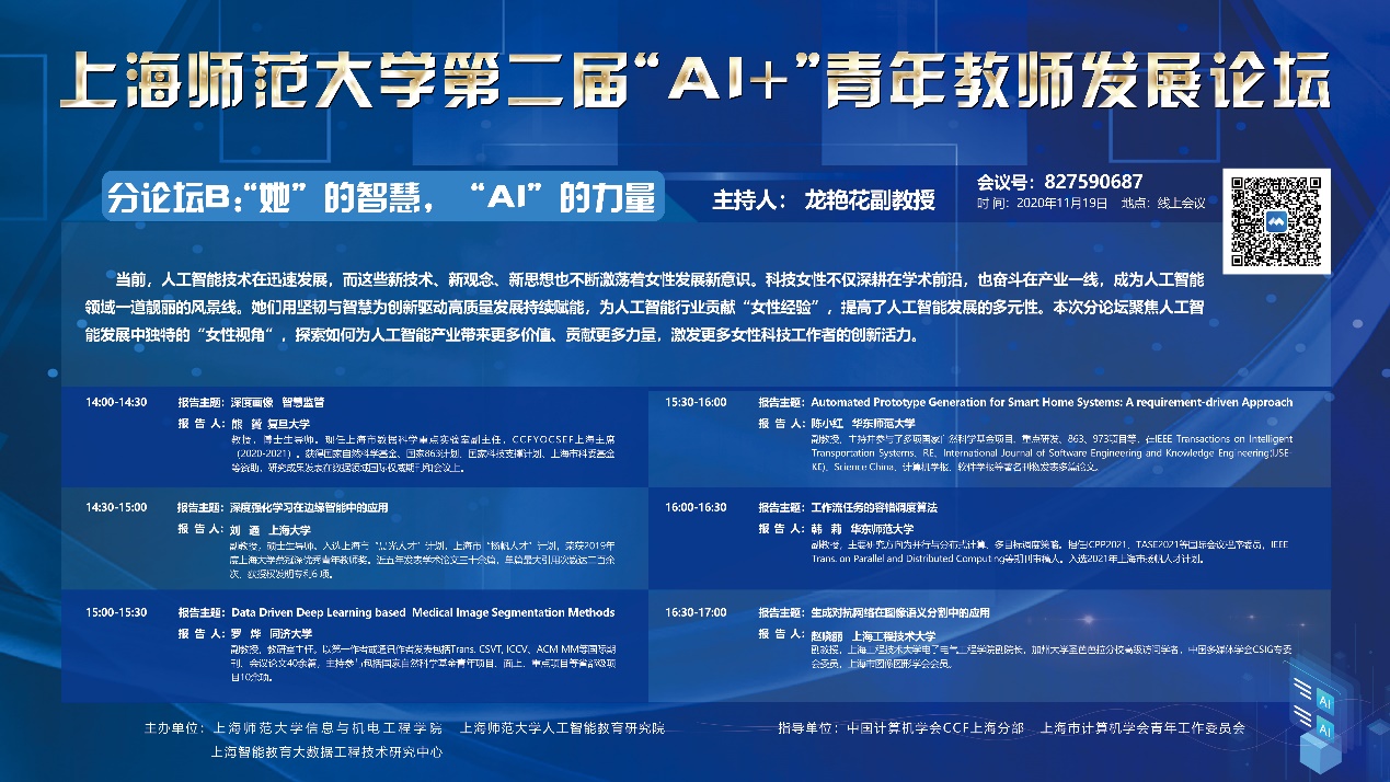 11月19日下午,上海师范大学第二届“AI+”青年教师发展分论坛活动以腾讯会议形式在线上举办。两个分论坛分别以“‘她’的智慧 ‘AI’的力量”和“‘5G+AI’赋能数字化转型”为主题,来自上海大学、上海交通大学、上海工程技术大学、同济大学、复旦大学、华东师范大学等多所高校的11位专家学者,我校信息与机电工程学院青年教师和部分研究生、本科生近700人参加论坛。