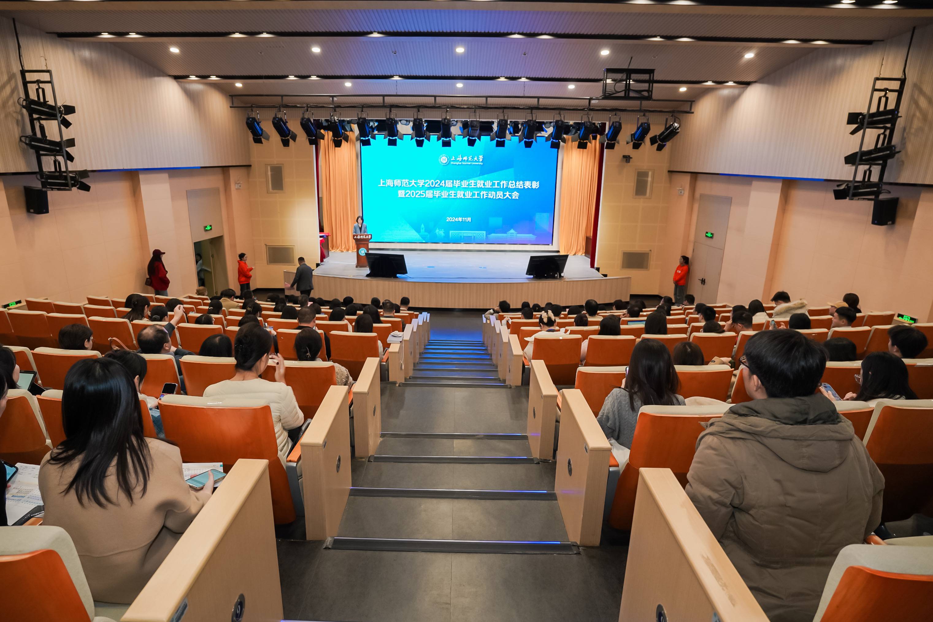 11月27日下午,2024届毕业生就业工作总结表彰暨2025届毕业生就业工作动员大会在教苑楼多功能厅召开。校长袁雯、校党委副书记、副校长朱惠军、上海市教委学生处处长丁良、金山区教育局等20家我校大学生最佳雇主单位代表、各学院党政正职、相关职能部门领导、各学院学生工作副书记、负责人、专业负责人、辅导员代表出席会议。
