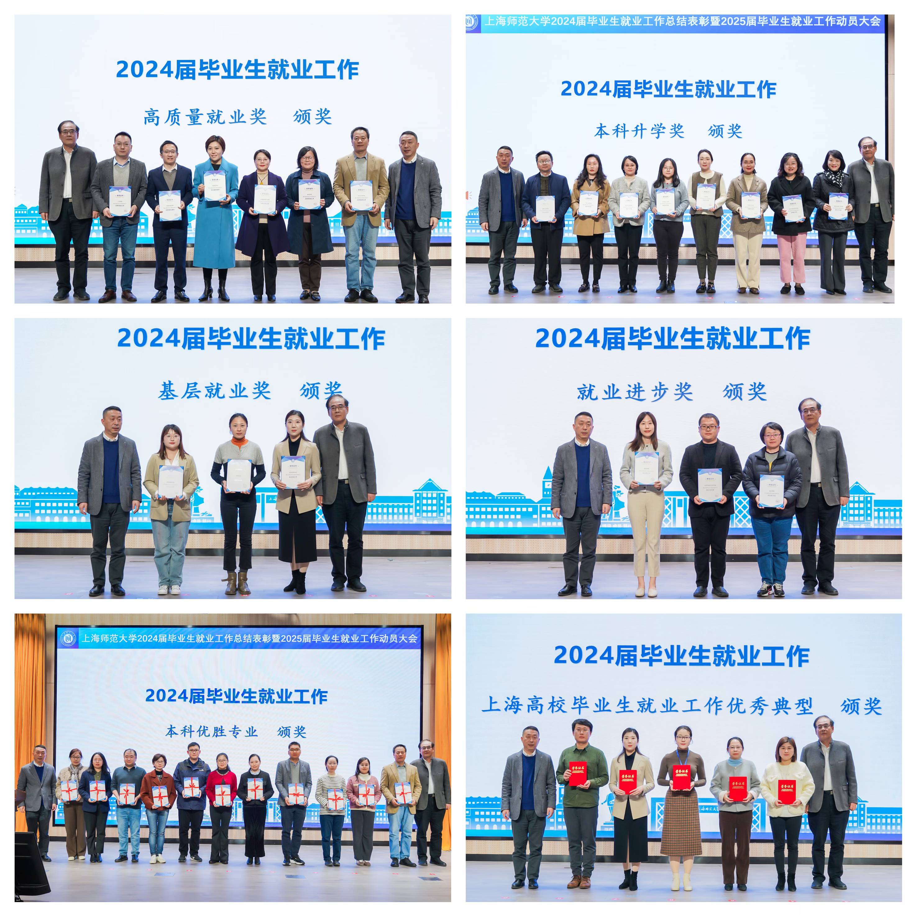 影视传媒学院、数理学院、生命科学学院、化学与材料科学学院、环境与地理科学学院、建筑工程学院获评“就业工作先进集体”;人文学院、教育学院、学前教育学院、外国语学院、对外汉语学院、上海退役军人学院获评“高质量就业奖”;心理学院、哲学与法政学院、马克思主义学院、对外汉语学院、生命科学学院、化学与材料科学学院、信息与机电工程学院、建筑工程学院获评“本科升学奖”;学前教育学院、旅游学院、影视传媒学院获评“基层就业奖”;教育学院、音乐学院、化学与材料科学学院获评“就业进步奖”;汉语言文学(文科基地)、英语、经济学(中法合作)、投资学、文化产业管理、汉语国际教育、雕塑、绘画、广播电视学、广播电视编导、摄影、数学与应用数学(师范)、物理学(师范)、数学与应用数学、物理学、化学(师范)、科学教育、生物技术、生物科学、应用化学、机械设计制造及其自动化(中美合作制造工程技术)、工程管理获评“就业工作本科优胜专业”;教育学院、学前教育学院、哲学与法政学院、外国语学院、商学院、美术学院、影视传媒学院、环境与地理科学学院、建筑工程学院、上海退役军人学院获评“暑期职业训练营优秀组织奖”;周芸、韩笑、吕霞、蔡琼霞、胡鹏斌获评“2024年上海高校毕业生就业工作优秀典型”;28名教师获评“就业工作先进个人”;19名教师获评“均融升学指导奖”;72名教师获评“就业推荐奖”。会上对所有获评单位和个人进行了表彰。