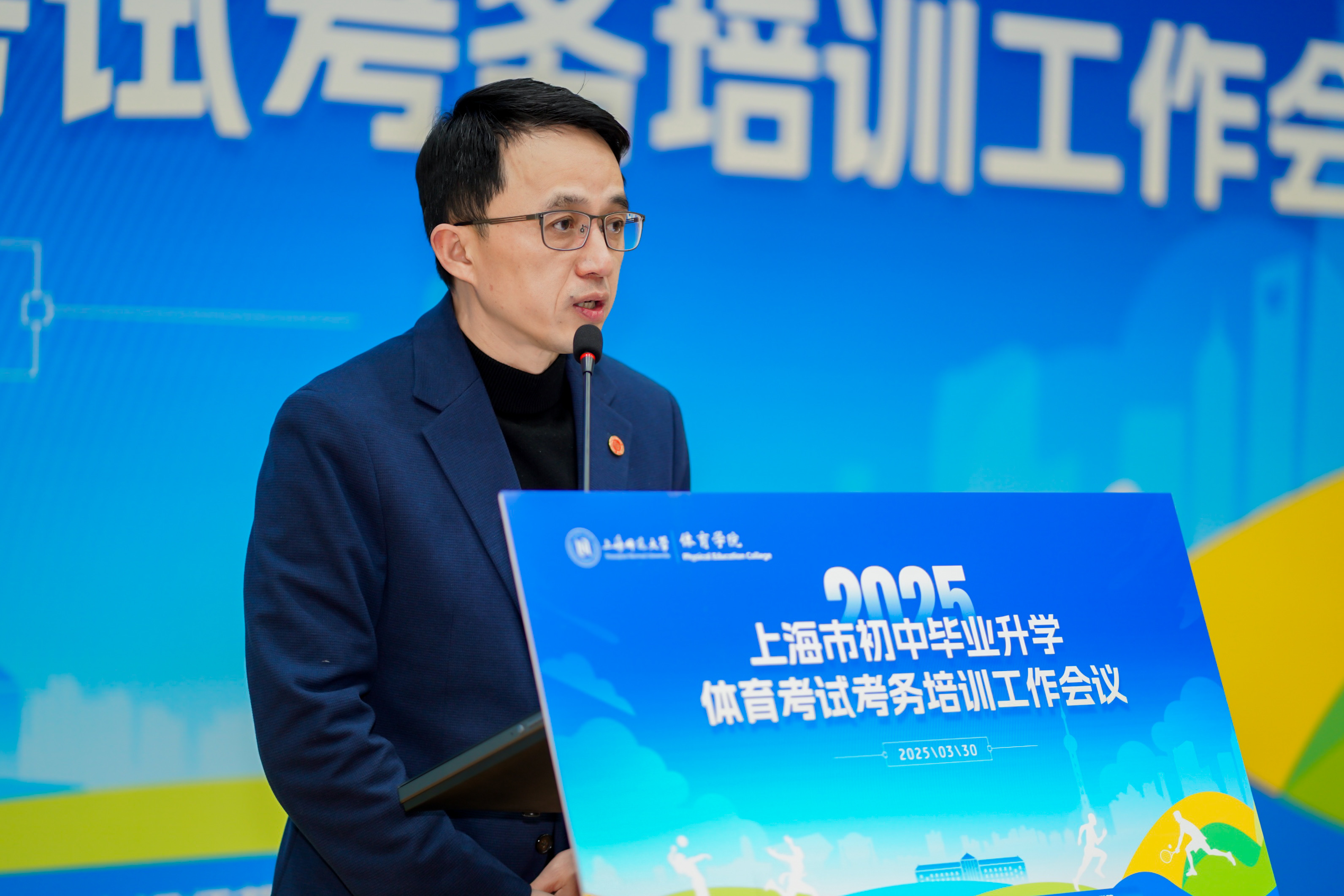 3月30日下午,2025年上海市初中毕业升学体育考试考务培训工作会议在我校西部球类馆召开。市教委体卫艺科处处长陈华、体育学院党政领导班子成员,各区教育局主管体育负责人、教研员、考务人员等400余人参会,会议由上海师范大学体育学院院长薛原主持。