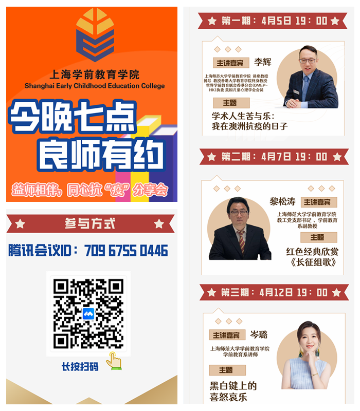 严峻复杂的疫情态势打乱了学生正常的学习与生活,长时间居家居寝隔离,不少学生产生了焦虑与压抑。为此,学前教育学院开展“今晚七点,良师有约”师生“云”陪伴线上分享系列活动,邀请院内著名教授、导师做客线上腾讯会议,在特殊时期与学生一起畅谈学术人生,分享抗“疫”故事,为学生送上温暖的心灵慰藉,给予强大的精神支持与力量。