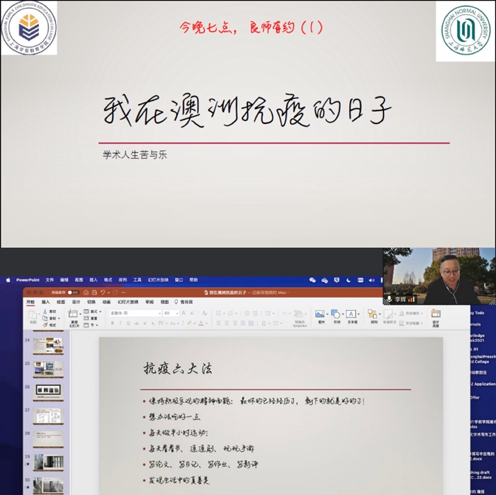 首场良师有约“云”端相伴活动邀请到的是上海师范大学学前教育学院讲座教授、博士生导师、香港大学教育学院终身教授李辉。李辉教授以“学术人生苦与乐:我在澳洲抗疫的日子” 为主题,为同学们讲述了他在澳洲任教期间经历的抗疫故事。长期的居家隔离生活让他更加明白家人的意义和自由的可贵,逐渐形成了高度自律的习惯。隔离期间,他坚持思考和写作,基于生活实践发展探索性创新思维,在完成防疫任务的同时,也迎来自己人生的学术高产期。面对此次疫情中同学们普遍存在的心理焦虑问题,李辉教授用亲身经历总结了“抗疫六大法”,以此鼓励居家居寝的学生积极调试和保持乐观积极的心理状态,缓解疫情带来的焦虑和压力,提升应对困难挫折的能力。互动提问环节里,同学们就研究方向选择、学术人生思考等问题与李教授展开热烈讨论。现场师生互动交流频繁。