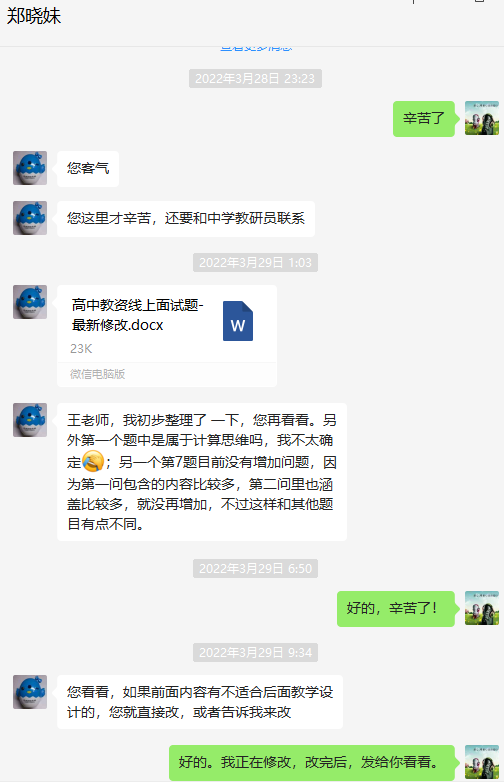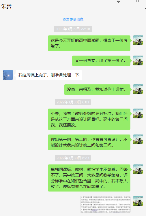 封控“宅”家的日子里,几位老师克服了家务繁多、教学任务重、监督孩子网课等诸多困难,组织安排考务、群组沟通。为了设计试题,郑晓妹老师经常熬夜到午夜。为了应对临时通知核酸检测导致考官人数不足的问题,系里还专门安排了徐晓钟、朱媛媛、任磊三位老师作为后备考官。