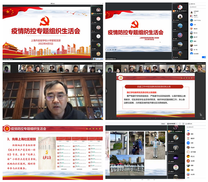4月5日,上海市实验学校各教工党支部分别召开线上疫情防控专题组织生活会,深入学习贯彻习近平总书记关于疫情防控的重要指示精神,贯彻落实孙春兰副总理考察上海时提出的有关工作要求,按照市委有关工作部署,坚决守住疫情防控底线,切实维护师生生命健康和学校发展稳定大局。