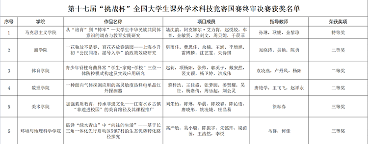 商学院的项目《一花独放不是春,百花齐放春满园——上海小升初“公民同招,摇号入学”的政策效应研究》、体育学院的项目《青少年脊柱弯曲异常“学生-家庭-学校”三位一体防控模式构建及实践应用研究》、数理学院的项目《一种面向气体探测应用的高灵敏度热释电单晶红外探测器》分别荣获二等奖;美术学院的项目《加强素质教育,传承非遗文化——江南水乡古镇“非遗进校园”的美育路径及其课程推广》、环境与地理科学学院的项目《破译“绿水青山”中“向往的生活”——基于长三角一体化先行启动区5镇7村的生态优势转化路径探究》分别荣获三等奖。
