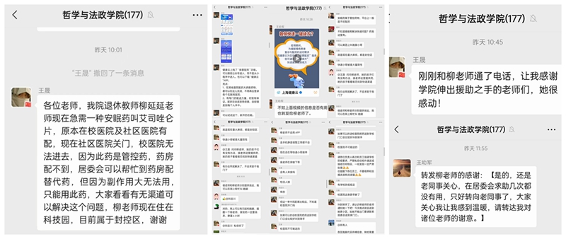 “我院退休教师柳延延老师马上断药了,现在急需一种安眠药叫艾司唑仑片......”弹出的一则消息打破了哲学与法政学院群的宁静。柳老师原本在校医院及社区医院配药,但是社区医院因为疫情关门,校医院因为疫情无法进入,又因为此药是管控药,药房配不到。居委会可以帮忙到药房配替代药,但因为副作用太大,经常头晕、头疼无法继续使用,只能换回以前吃的药。在这非常时刻,王晟老师急忙把求助信息发到同时群,请求大家群策群力,看看有无渠道可以帮忙解决这个问题。