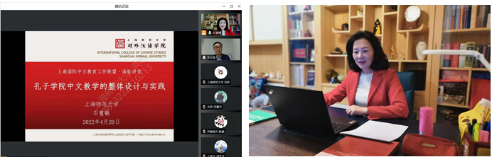 4月20日晚七点,由我校国际交流处承办的上海国际中文教育工作联盟“语虹讲堂”第九期讲座如期在线开讲。对外汉语学院石慧敏副教授以“孔子学院中文教学的整体设计与实践”为题,为大家带来了精彩的讲座。参加聆听本次讲座的有海内外孔子学院的院长、公派教师、志愿者以及各院校的汉硕专业的同学。