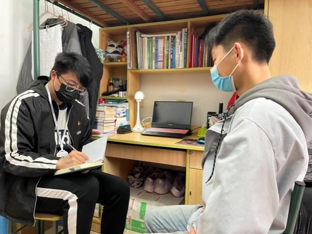 我负责奉贤校区22号宿舍楼,有来自9个学院的在校学生208人,楼内既有本科生也有研究生。除了自己所带的学生外,我主要负责的就是落实22号宿舍楼的网格化管理,带领楼层长、学生党员、入党积极分子等学生骨干队伍,排摸底数、核对数据,组织学生完成每一次的核酸检测,做到应检尽检、不漏一人。在刚刚接管22号楼的时候,对楼里情况不了解,由于不少同学不在校,所以也缺少学生骨干队伍。于是我在拿到楼里名单后,找到楼里的学生党员、入党积极分子、学生干部等骨干,建立起了临时楼层长队伍,带领学生一间一间寝室排摸人数,并建立起在校生大群和各楼层小群,方便后续发布通知、和同学们之间交流。