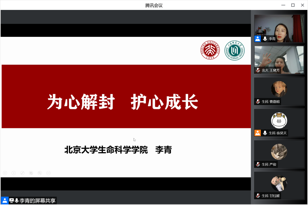 4月27日晚,由我校生命科学学院和影视传媒学院联合举办的“人生导师”沙龙通过腾讯会议线上举行。北京大学生命科学学院专职心理咨询师李青老师带来“为心解封 护心成长”专题讲座,引导同学们在严峻的疫情考验下缓解身心压力、调整精神状态,以更加积极向上的心态正确应对疫情。北京大学生命科学学院党委副书记唐平老师,上海师范大学生命科学学院党委副书记、副院长谢月恒老师出席本次讲座,上海师范大学影视传媒学院党委副书记、副院长戴宁宁老师主持活动,两院200余名学生报名参加,共赴这场云端心灵之约。