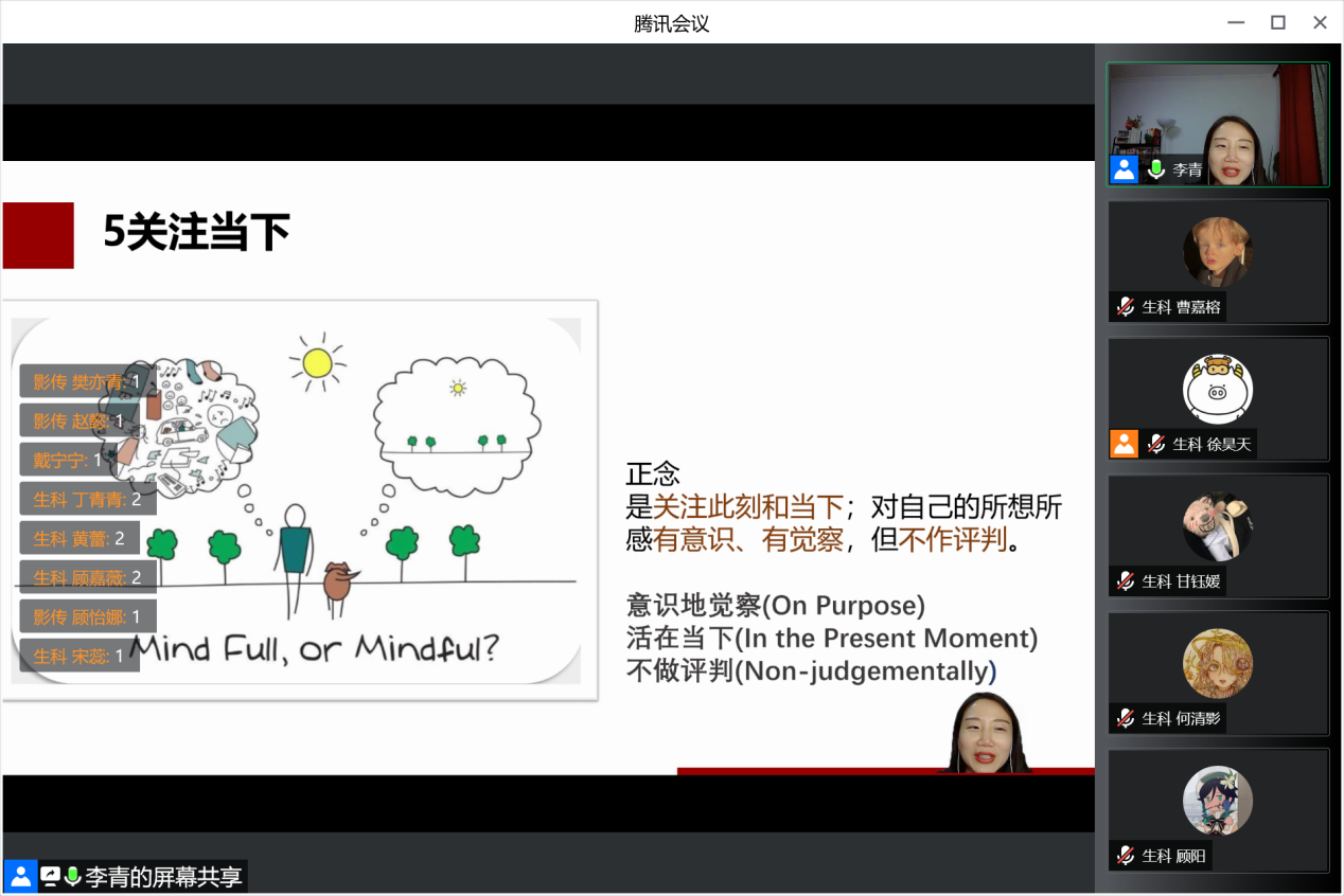 讲座中,李青老师从介绍人的情绪曲线入手,分析了同学们在面对上海本轮高发疫情袭击之下的心理变化过程和提前收集的来自上海同学们目前各种各样的情绪以及背后的困扰,希望同学们一定要正视自己情绪发生的变化,这是应对这些情绪问题的第一步。随后,李青老师以请同学们给自己现在的状态打分作为引入,结合具体事例,形象生动地分享了目标思维(如四象限工具)、管理入口(如向负能量消息说不)、打开出口(如倾诉、哭泣、画画)、恢复平衡(如听音乐和腹式呼吸)、关注当下(如正念)、建立支持(如协调好寝室人际关系)、发掘乐趣(如幽默、童趣、创作)等七种方式去调整好自己内心“小人”的情绪状态。李青老师特别介绍了正念这一心理技法。简单地说,正念是关注此刻和当下;对自己的所想所感有意识有觉察,但不做评判,有减轻压力、减轻抑郁焦虑症状、增加专注力、增加满足感和幸福感等好处。李青老师还带领屏幕前的同学们进行了正念练习,帮助大家放松身心,领略这一方法的神奇魅力。