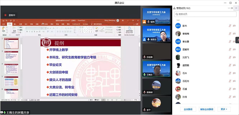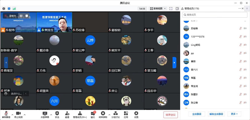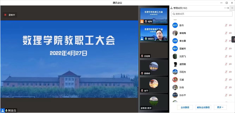 4月27日下午13:30,数理学院召开线上教职工大会,183位学院教职工如期参加,会议由学院党委书记樊连生主持。