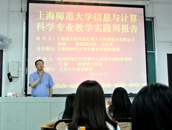 数理学院数学系信息与计算科学专业于6月27日下午在奉贤校区2教202教室举行了以“增强实践,提升能力”为主题的教学实践周专业拓展报告及实践周动员会。学院李昭祥老师为数学系信息与计算专业2013级、2014级和2015级所有本科生及部分数学和应用数学及统计专业学生做实践周的动员报告。随后,浦东软件园汇智人力资源服务有限公司总经理徐俊应邀做题为《互联网时代大学生职业生涯的规划》,杭州阿里巴巴资源中心研发与团队管理部的王超总工程师做题为《工具平台建设漫谈》的实践专业拓展报告,两位从我校数学系信息与计算科学专业走出去的杰出校友结合自己的成功经历,与同学们分享了自己学习的喜与乐,大大坚定了同学们专业学习和实践的信心,开拓了大学生的视野。