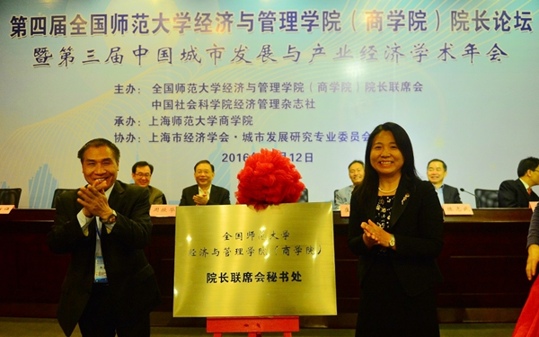 开幕式上宣布了全国师范大学经济管理学院(商学院)院长联席会有关“全国师范大学经济与管理学院(商学院)院长联席会秘书处设在上海师范大学商学院”的决议,北京师范大学政府管理研究院院长唐任伍教授和上海师范大学科研处处长马英娟教授共同为秘书处揭牌。
