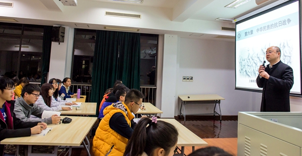 课堂上,张峥嵘紧紧围绕教材第六章节《中华民族的抗日战争》的内容,从日本发动侵华战争之前中国的形势讲起,以时间为轴线,从局部抗战到全国性抗战,从国民党战略防御和相持阶段的正面战场到中国共产党成为抗战的中流砥柱,讲述了从1931年九一八事变到1945年抗日战争胜利这十四年来中国人民的艰苦战斗。课堂中,张峥嵘更注重从关乎党和国家发展前途命运、领导干部普遍关注的基本问题和重大问题入手设计课程内容,以中国共产党在抗日战争中做出的伟大贡献为切入点,结合中国共产党如何延续“长征精神”坚持抗战和习近平总书记十八届六中全会关于“从严治党”的重要论述,以开放的专业视角,丰富的知识储备,帮助学生理解历史与现实,在不断学习理论,学懂理论中明确青年的责任与担当。