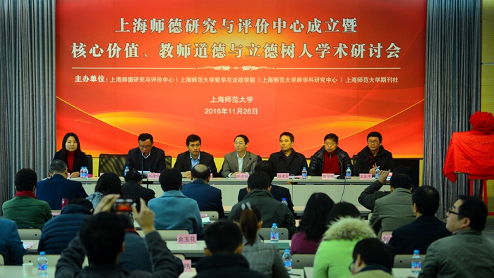 2016年11月26日,在教育部教师工作司、上海市教卫工作党委、上海市教委和上海师范大学领导的大力支持下,上海师德研究与评价中心成立暨核心价值、教师道德与立德树人学术研讨会在上海师范大学成功召开。上海市教卫工作党委副书记兼市教委副主任高德毅、教育部教师工作司特派代表正处级调研员赵建军、上海师范大学党委书记滕建勇、副校长高建华和来自复旦大学、华东师范大学、上海交通大学、同济大学、华东理工大学、北京师范大学、南京师范大学、杭州师范大学、上海师范大学的上海与全国著名专家学者,以及上海市中小学名校校长、教师代表等120余人出席中心成立大会和学术研讨会。
