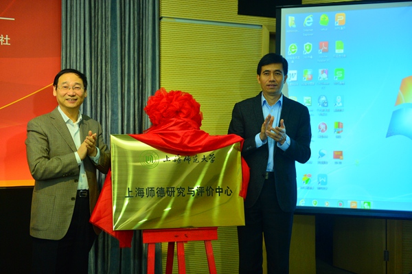 成立仪式最后,在全体代表的热烈掌声中,上海市教卫工作党委副书记兼市教委副主任高德毅和上海师范大学党委书记滕建勇共同为上海师德研究与评价中心隆重揭牌。