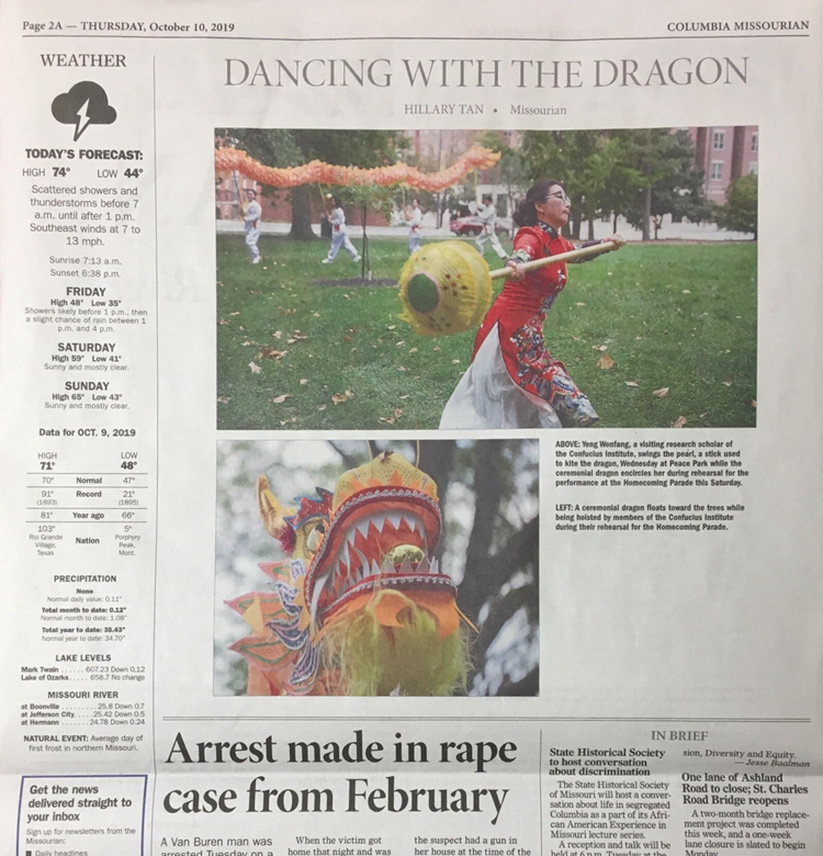 精彩纷呈的舞龙表演,离不开孔子学院全体老师和志愿者的辛勤努力和积极付出。在将近一个月的排练过程中,大家恪守职责完成备课和上课任务,利用休息时间参加舞龙排练。排练现场便吸引了密苏里大学新闻学院的学生前来采访、拍摄,并将舞龙活动提前“剧透”刊登在当地《COLUMBIA MISSOURIAN》的报纸上,呼应“中国巨龙”的高调亮相。