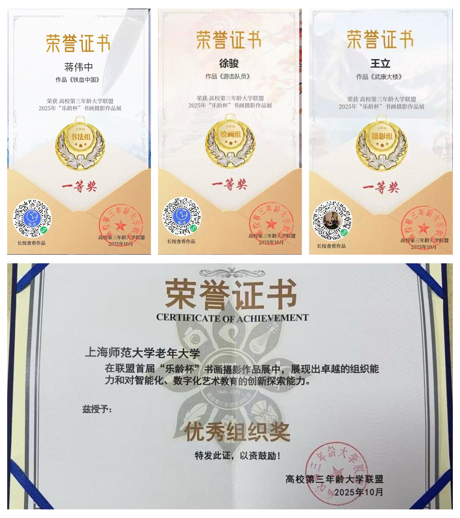 为纪念中国人民抗日战争暨世界反法西斯战争胜利80周年,进一步弘扬中华优秀传统文化,充分展示老年大学书画摄影教学成果,进一步推动老年教育的高质量发展,高校第三年龄大学联盟于2025年9-10月举办首届“乐龄杯”书画摄影作品展。全国59所老年大学的1214件作品参展。经专家评审,共有623件作品获奖。我校老年大学有31件作品获奖。