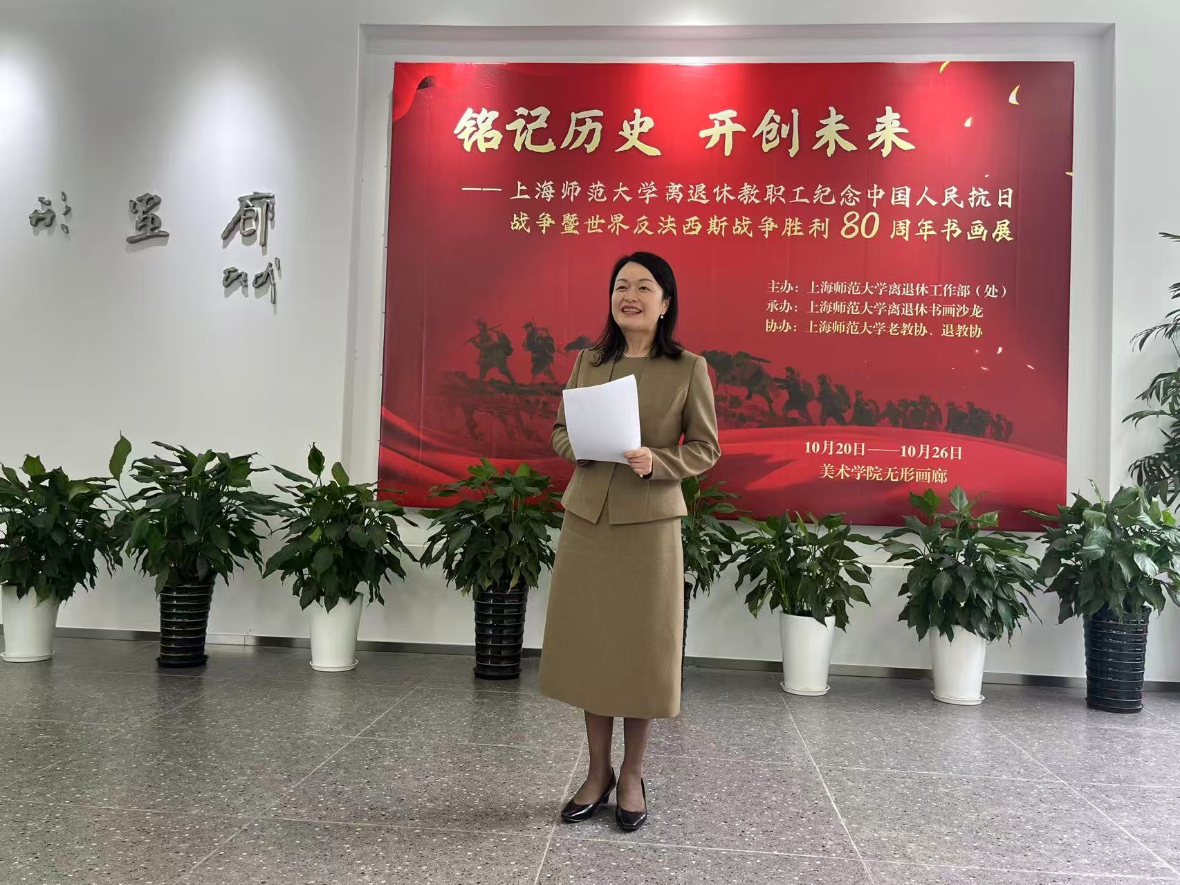 杨海燕首先代表党委向老同志们致以节日问候和衷心祝福,向参与书画展的老同志们表示衷心的感谢。她指出,老同志的作品,凸显了上师大老同志深厚的学术人文底蕴,展现了上师大优良的学风、教风和校风。整个书画展呈现出浓厚的人文气息和情怀,以纪念中国人民抗日战争暨世界反法西斯战争胜利80周年为主题,更体现了离退休老同志深厚的家国情怀。同时,她还向老同志通报学校正在制定“一校一策”的综合改革方案,从明晰办学定位、提升育人实效、聚焦贡献服务等方面系统介绍了当前教育改革的形势任务、学校综合改革的方位路径与发展思路。她指出,学校将坚持以“重服务、强贡献”为导向,以凝练办学定位为先导,以人才培养改革为核心,紧密围绕科技创新、国家战略需求和上海城市经济社会需要,不断强化在教育强国和教育强市的新征程中主动作为,希望老同志们积极为师大的发展建言献策。最后,她祝愿本次书画展取得圆满成功。祝愿老同志们身体健康,阖家幸福,万事如意。