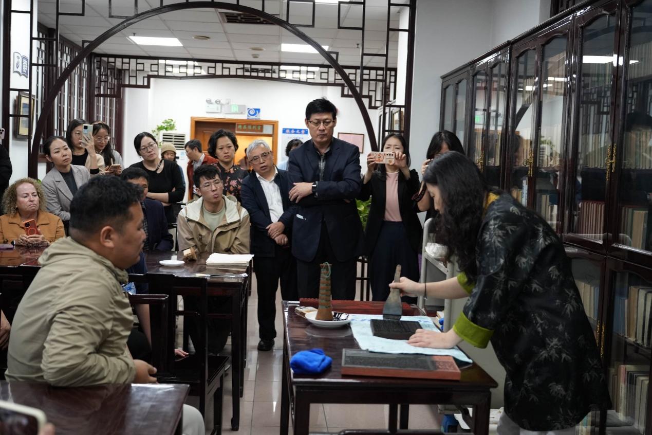 活动在宋雪春副研究馆员的导览中拉开序幕,精彩的解读带领校内外师生第一次近距离地接触古籍并亲手操作雕版印刷。在姚美凤的悉心指导下,各族师生们饶有兴致地体验上墨、铺纸、刷印等传统工艺流程。方寸之间的雕版,不仅印出文字图案,更印出对千年文明的敬畏与连接。