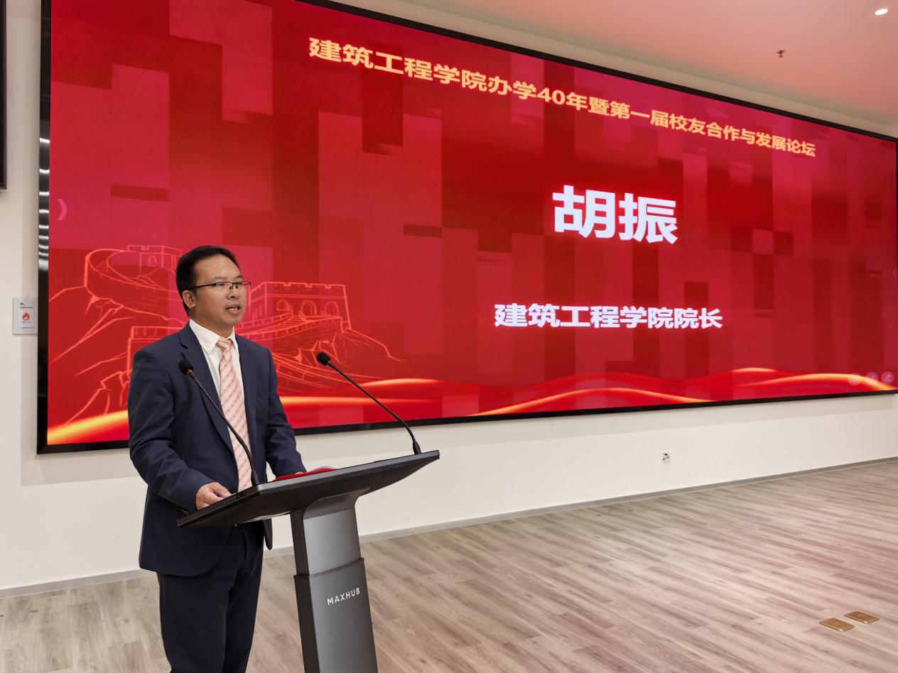 建筑工程学院院长胡振代表学院向四十年来关心支持学院发展的学校领导、学院老领导、广大校友和全体师生致以最诚挚的感谢和最崇高的敬意。他从人才培养、学科专业建设、师资队伍建设、平台构建、合作办学、社会服务、内部治理保障等方面全面回顾了学院取得的显著成就。他指出,未来,建筑工程学院将精准对接学校上位规划,坚持“四新”发展战略,致力于打造科工教育新高地,培育学科增长新潜力,构建人才培养新体系,提升社会服务新能级,开启学院高质量发展的新篇章。