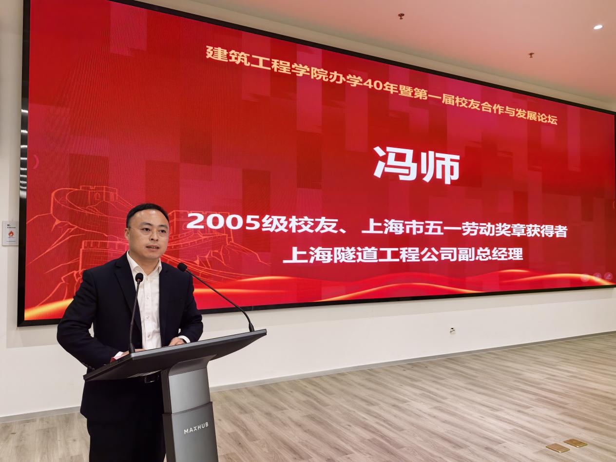 校友代表发言环节,1992级校友、上海建工七建集团副总工程师尤雪春在发言中回顾了其参与多项国家重大工程的经历,指出建筑业正面临向智能化、数字化转型的关键时期。他建议学院加强智能建造人才培养,并希望校企能通过共建产业学院、推行校企双导师制、共建实训基地、引入真实项目案例等方式深化合作,帮助学生掌握前沿技术。2005级校友、上海市五一劳动奖章获得者、上海隧道工程公司副总经理冯师聚焦于未来校企合作的广阔空间,提出可在国际工程实践、智慧城市运营及长三角一体化建设中深化产学研融合。他期待校友资源、企业需求与学院智慧更紧密地结合,实现传承、创新、共赢的良好局面,让建工精神在新时代的新工科之路上持续闪耀。