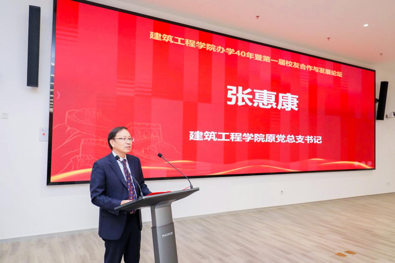 张惠康代表学院老领导致辞。他在发言中深情回顾了学院创业时期的艰辛与感动。他提到,当时虽面临师资薄弱、设施简陋等挑战,但全院师生始终团结一心、艰苦创业,为学院后续发展奠定了坚实基础。如今看到学院在学科建设、人才培养、国际合作等方面取得的丰硕成果,他感到无比自豪与欣慰。他特别肯定了学院当前领导班子与师生团队的开拓精神,并对广大校友在各行各业取得的成就表示祝贺。他寄语学院在新起点上继续弘扬传统、勇于创新,共同谱写建筑工程学院更加辉煌的明天。
