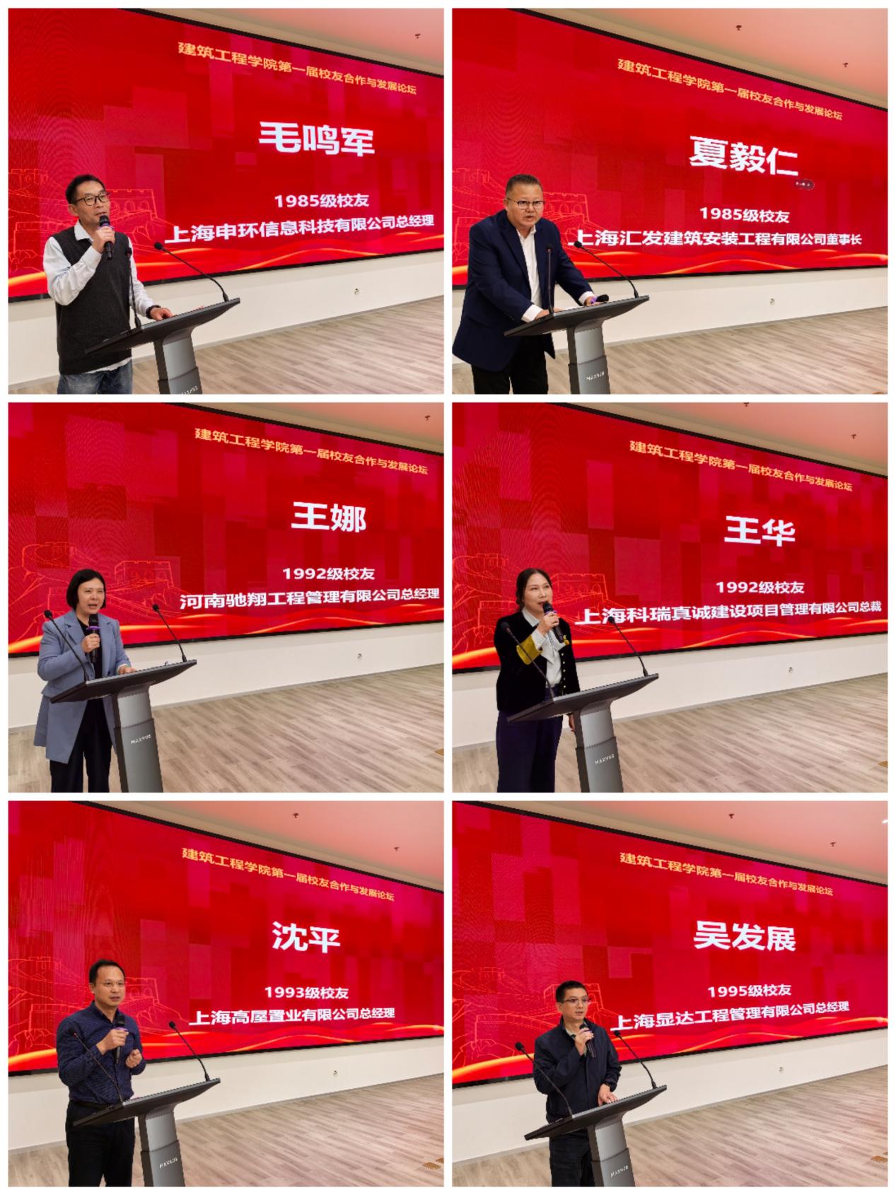 第一届校友合作与发展论坛由胡振院长主持。1985级校友、上海申环信息科技有限公司总经理毛鸣军,1985级校友、上海汇发建筑安装工程有限公司董事长夏毅仁,1992级校友、河南驰翔工程管理有限公司总经理王娜,1992级校友、上海科瑞真诚建设项目管理有限公司总裁王华,1993级校友、上海高屋置业有限公司总经理沈平,1995级校友、上海显达工程管理有限公司总经理吴发展等六位校友代表相继发言。毛鸣军分享了其在上海师范大学读书的经历和创业工作的历程,建议加强学生通识教育与综合能力培养。夏毅仁感恩母校与师长教诲,强调校友网络在事业发展中的关键支撑,表示将积极调整思路应对行业挑战。王娜分享了从设计院到成功创业的历程,并诚挚邀请母校师生赴河南平顶山考察,深化地域合作。王华回顾了公司与个人共同成长的历程,并提出共建实训基地、联合科研等多维度校企合作构想。沈平深情回顾了从基层做起的职业生涯,并分享了其在奉贤主导开发项目的成功经验。吴发展表达了将恪守建工精神,在工程管理领域开拓奋进,为母校争光的决心。他们围绕行业前沿趋势、企业管理创新、校企合作模式等方面展开深入交流,现场思想碰撞,气氛热烈,为学院发展与校友合作提供了诸多新思路。