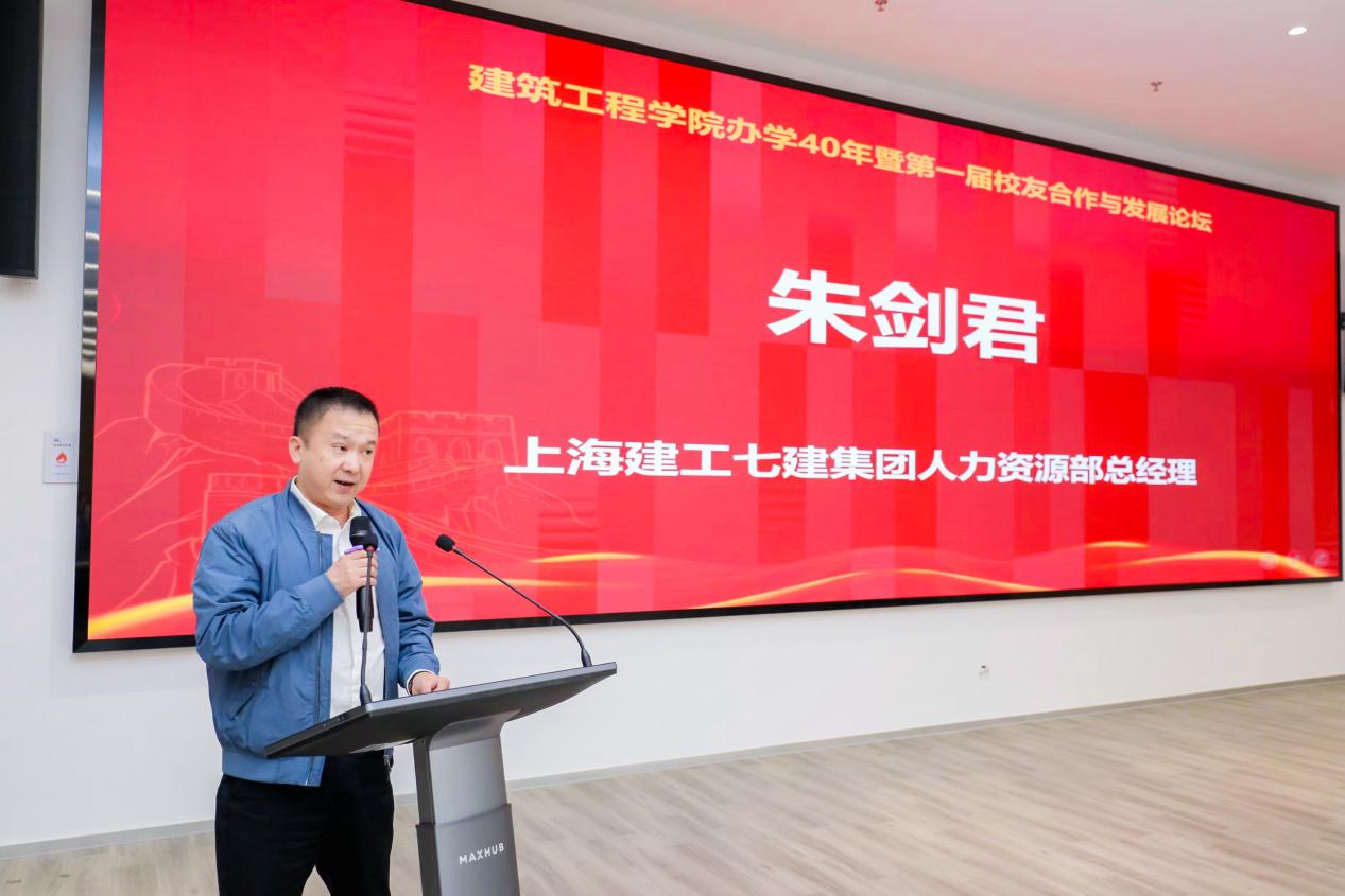 最佳雇主单位代表朱剑君对建筑工程学院办学40年取得的辉煌成就表示热烈祝贺。他介绍了上海建工七建集团的业务范围以及发展现状。他特别提到,集团内有64名全职员工毕业于建筑工程学院,其中多人已成长为业务骨干,这充分体现了学院卓越的人才培养质量。长期以来,七建集团与学院在人才输送、校园招聘等方面建立了稳定良好的合作关系,他希望今后持续与学院深化合作,共同推动产教融合,实现校企协同育人、共赢发展。