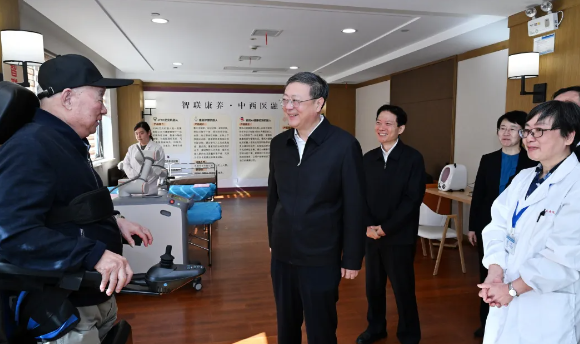 今天上午,陈吉宁来到闵行区虹桥镇敬老院看望慰问老年人,察看智慧医养平台和养老服务设施,了解综合照护及员工制管理工作情况。这家敬老院着力打造集机构照料、医养结合、短托及家床服务于一体的养老服务综合体,积极探索紧密型医养融合、机构与社区融合,一站式解决周边居民养老需求。在医务室、配药室,社区医护人员为老人提供诊疗服务,帮助老人通过互联网医疗复诊配药;在康复室,多种高科技设施辅助老人进行复健训练。