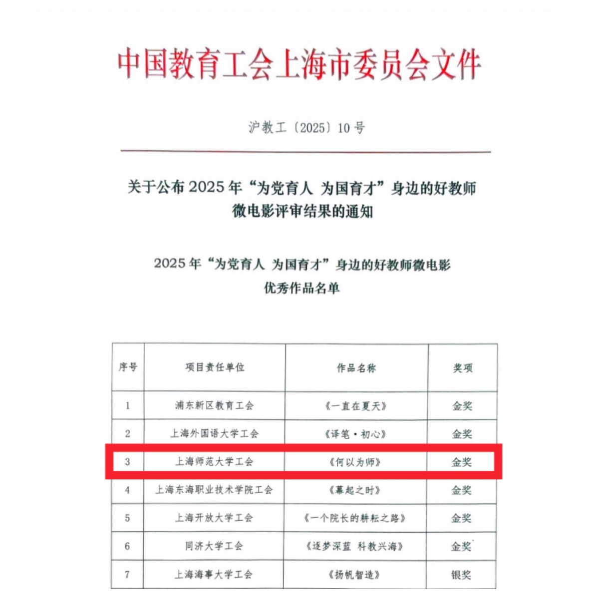 近日,上海市教育工会公布了2025年“为党育人 为国育才”身边的好教师微电影评审结果,我校报送的作品《何以为师》获评“金奖”。