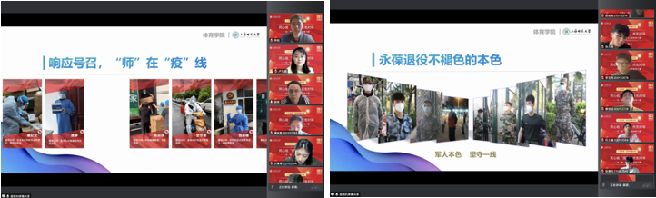 “疫”路有你—可敬的老师、可爱的同学、可靠的退伍兵,薛原为同学们讲述了疫情以来体育学院全体师生参与抗疫的感人事迹。他说,从学院党委书记武长河和部分专业老师主动参加社区志愿者到校内外参与抗疫的所有党员、入党积极分子、学生干部以及志愿者都充分展现了勇毅前行的体育力量,勇于担当、顽强拼搏就是我们要学习和弘扬的体育精神!薛原说道:“希望我们当代大学生,尤其是体育学院的学生要始终牢记体育人的使命和担当,传承发扬体育精神,积极弘扬正能量,充分展现体育人的风采。”同时,同学们积极配合学校各项防疫工作要求,认真上好每一节课就是为学校防疫工作做出的最大贡献。