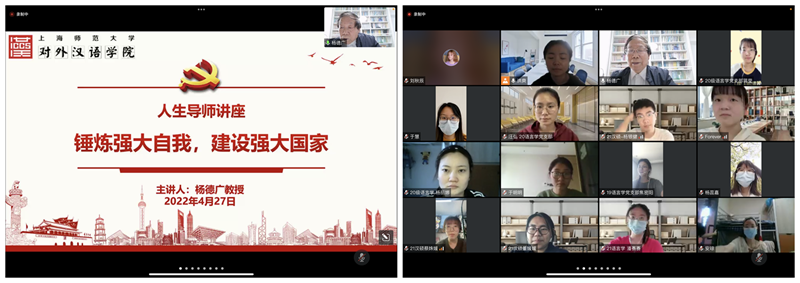 4月27日下午,对外汉语学院邀请原上海师范大学校长、中国当代教育名家、对外汉语学院党建工作室督导杨德广教授为师生作题为“锤炼强大自我,建设强大国家”的人生导师沙龙讲座。在讲座中,杨教授分享自己的抗疫经历与感受,坚定青年学子坚持“动态清零”的决心,强化了在抗击疫情时的社会责任与担当。学院近百名学生以腾讯会议方式参加。