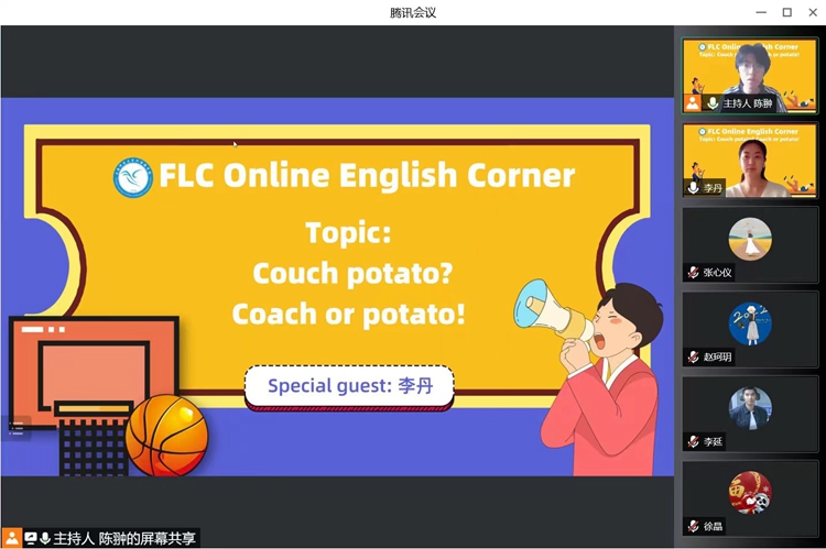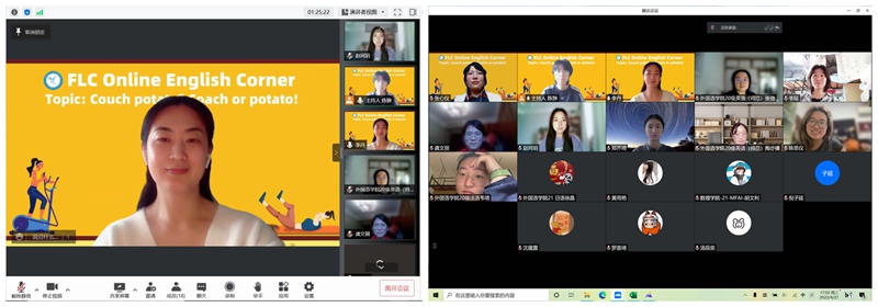 4月27日,由外国语学院组织的第二场云端英语角活动如约而至。本次英语角活动以 “Couch potato? Coach or potato!”为主题,特邀外国语学院副教授,笔译专业硕士生导师李丹作为活动嘉宾,与来自不同学院的25位同学共同分享、讨论居家或在校期间如何安排课余时间,丰富课余生活,保持身心健康。活动开始后,嘉宾联系活动主题,与同学们分享了英语中与“potato”相关俚语并引入讨论主题。活动进行期间,针对嘉宾提出的时政话题,同学们积极参与、各抒己见,对战“疫”背景下的社会现象展开深入探讨。此外,李丹老师与同学们分享了战“疫”相关的英语政治政策类专有名词,将热点时政与英语学习相结合,鼓励同学们合理利用网络资源,在进行视听、阅读材料的输入的同时,积累语料,多加练习、勇于表达。