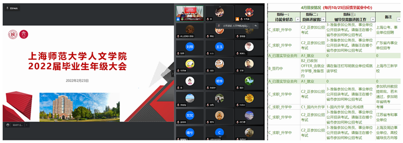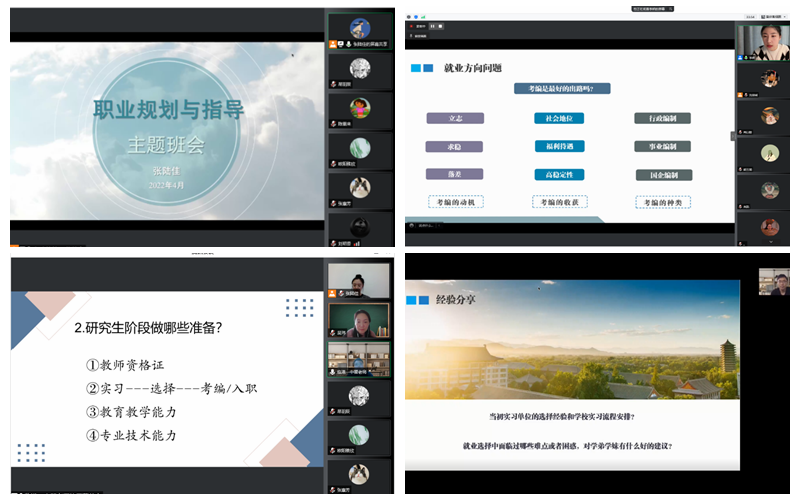学院组织开展低年级就业类主题班会,结合近年来疫情之下的就业形势,提醒同学们要结合实际情况,从认知自己、认知职业、认知自己与职业匹配度三个维度选择适合自己的岗位;通过分析展示师大往年就业数据、解答具体就业问题疑惑、探讨交流专业选择初心等方式,为同学们提供“寻找核心职业价值感”“未雨绸缪、日积月累” “稳中求稳、变中求变”的就业选择建议。邀请2017级校友、临港一中语文老师瞿重律,从中小学语文老师的选择、研究生阶段做好语文老师的就业准备、语文老师的专业素养三方面展开分享,详尽解答与反馈同学们所关心的就业、实习问题;邀请2018级校友、松江区第七中学历史老师岳增帅、2019级校友、上海图书馆(上海科学技术情报研究所)工作者顾铃,就职业定位、实习与在校经历、招聘信息三个主题与同学们分享心得体会。