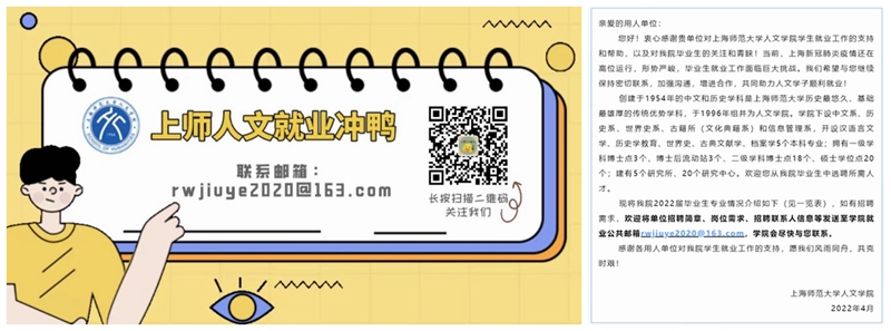 “上师人文就业冲鸭”微信公众号是人文学院面向学生发布就业信息的主要平台。学院依托公众号发布用人单位和学生服务指南,加强就业实习信息更新推送,定期发布事业单位招聘、企业招聘等用人单位招聘信息,不定期推送“简历制作要点”“教师编制考试备考经验”等就业技巧和经验信息。通过“2022年上海师范大学人文学院致用人单位的一封信”向用人单位广泛征集招聘需求,以“加强沟通,增进合作,共同助力人文学子顺利就业”为期冀,为毕业生提供就业聚合信息。同时,学院还依据不同专业学生就业需求,建立语文、历史师资招聘信息群,送信息、送政策、送指导。