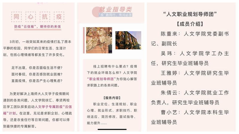 学院启动“上海师大人文学子专属防疫行动”,为人文学子提供专属防疫“云信箱”,收集学生问题诉求,并由专业导师团提供求职企划、心理疏导等专属解答。针对就业指导类问题,由“人文职业规划导师团”和“人文心理援助导师团”提供职业定位、生涯规划、职业心理、职场适应、面试指导等一系列服务内容,贴心解答、细致分析。“导师团”由学院学工团队、兼职辅导员担任,共同保障解答的全面性、专业性与及时性。