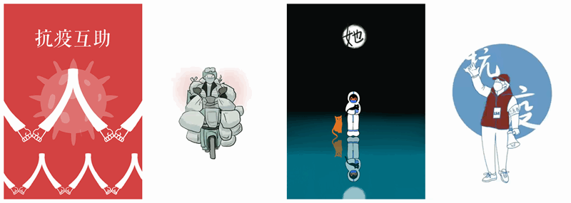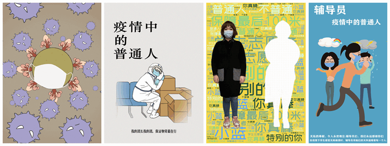这次疫情物资紧张的情况下,有很多普通人担起了责任,为我们保障了基本生活需求。他们有的是勇敢站出来为大家团购物资的团长,有的是主动为我们送来物资的司机和志愿者们,还有穿梭在每个街道带来希望的外卖员们。我们在学校里看到这些送来的物资就像看到了希望。也许他们在疫情下过的并不轻松,但他们仍然能够积极乐观地付出。这三张海报还加上了一些声音的配合,希望能够使得这些疫情中的普通人画面更加具象。——黄雪莉