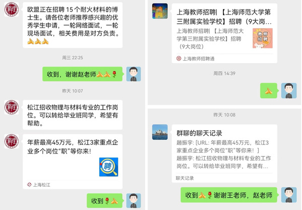 数理学院积极寻求在基础教育学校、高中任职的校友,咨询人才招聘事宜,进一步挖掘就业岗位。一周以来,陆续得到校友单位人才需求十余条,涉及岗位三十余个,包括上海师范大学附属中学、上海交通大学附中浦东实验高中、大同初级中学、上海市第二中学、浦兴中学、打虎山路第一小学等学校提供的优质岗位。