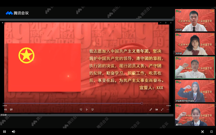 肩负青春使命,礼赞建团百年。2022年是党的二十大召开之年、五四运动103周年,也是中国共青团成立100周年。为深入贯彻落实习近平总书记关于青年工作的重要思想,持续强化青年思想引领和理论武装,激发广大团员赓续红色血脉、汲取奋进力量,5月4日晚19:00,上海师范大学教育学院、学前教育学院纪念五四运动103周年暨建团100周年主题活动以腾讯会议的形式线上圆满举办。两院师生共聚云端,同绘青春蓝图。