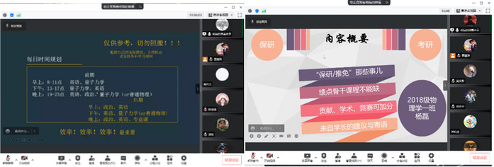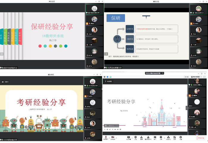 考研竞争日趋激烈,数理学院为了解答学生对于升学的困惑,挖掘自身潜能,早做准备、明确方向,于5月7日、8日举办4场线上考研、保研专题讲座,邀请了15位考研、保研成功的优秀学子分享经验。