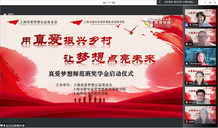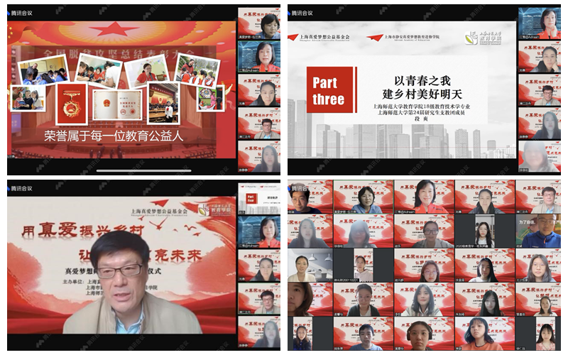 为响应“乡村振兴 教育先行”的时代号召,鼓励优秀师范生参与社会实践,提升教师技能素养,在上海师范大学教育发展基金会的鼎力支持下,上海真爱梦想公益基金会、上海市静安真爱梦想教育进修学院与我校教育学院共同举办“用真爱振兴乡村,让梦想点亮未来”真爱梦想师范班奖学金启动仪式。合作单位各级领导与老师出席此次活动,与青年学子共聚云端,同绘公益梦想。