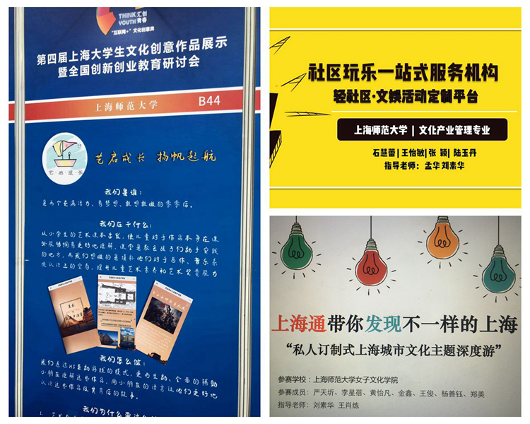 人文与传播学院文化产业管理专业的思政改革项目不仅仅注重学生专业能力的获得、文化自信的激发,专业核心课程中均注重引导学生对文化产业政策、趋势和前沿的把握与关注,并主张学生能立足社会需求,利用专业能力回馈社会、弘扬文化。获得“一带一路”文化创意创业大赛三等奖的2016级王怡敏等同学的《轻社区——社区文娱活动一站式服务机构》创业计划立足于社区文化娱乐需求,旨在为创建更美好的社区生活贡献力量,获得了评委一致认可以及投资机构的青睐,位列所在决赛小组第一。获得第四届上海大学生文化创意作品展示三等奖的2018级王珺等同学的《艺起成长 扬帆起航》,从小学艺术教育出发,通过开发H5趣味互动游戏,以寓教于乐的方式提高艺术教育效果。2016级姚歆怡、陆玉丹同学的《沪语课堂》针对上海地区沪语教育衰落的现实,重新发掘沪剧这一上海非物质文化遗产,让其更符合当下互联网时代年轻群体的需求和兴趣,并借助沪剧传播沪语,该项目获得第四届上海大学生文化创意作品展示三等奖。2016级严天圻、金鑫等同学的《私人订制式上海城市文化主题游》创业计划,则把握到文化旅游的发展趋势,挖掘上海城市文化中现代及传统特色,开拓个性化、沉浸体验式的城市文化主题游,获得“一带一路”文化创意创业大赛优秀奖。